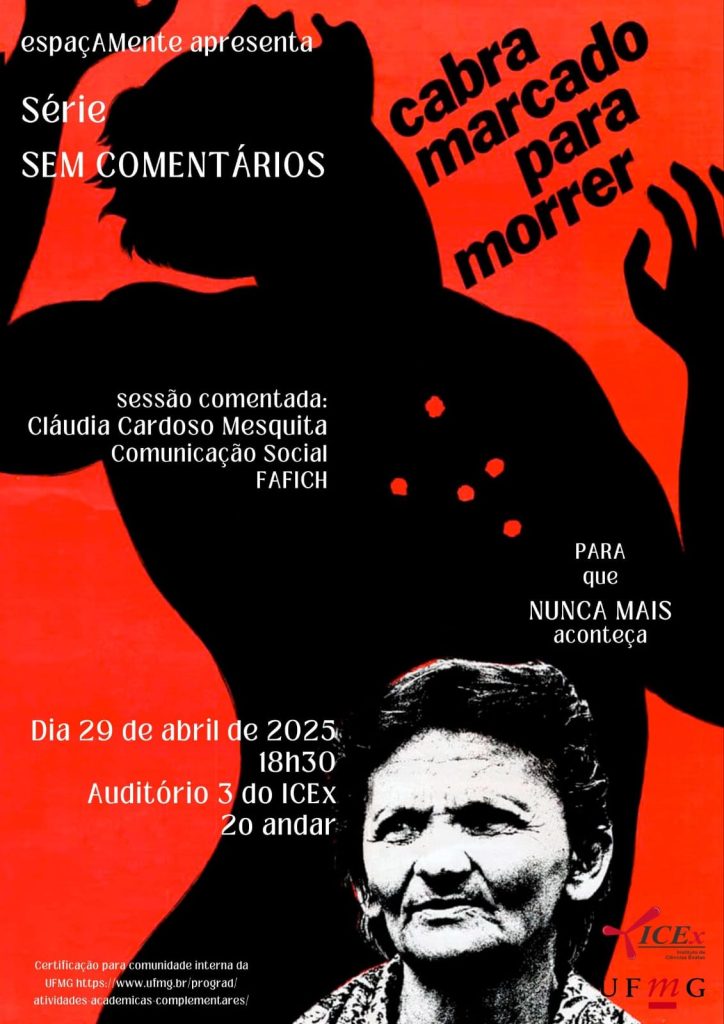 A segunda sessão da Série SEM COMENTÁRIOS será realizada no dia 29 de abril de 2025, às 18h30, no Auditório 3 do ICEx (2º andar), quando será exibido o documentário Cabra Marcado para Morrer, um filme de Eduardo Coutinho, com comentários da Professora Cláudia Cardoso Mesquita, do Departamento de Comunicação Social da FAFICH.